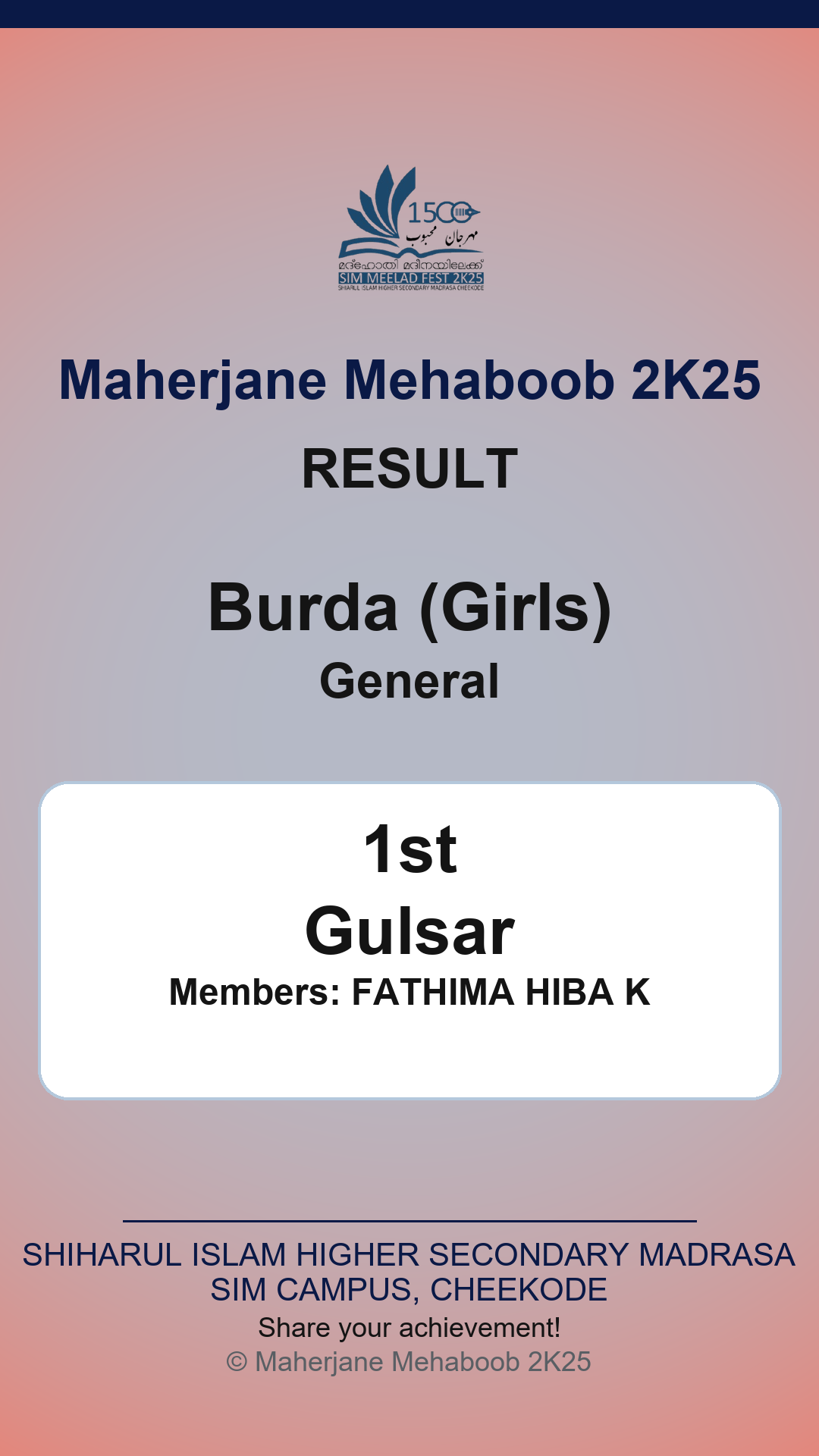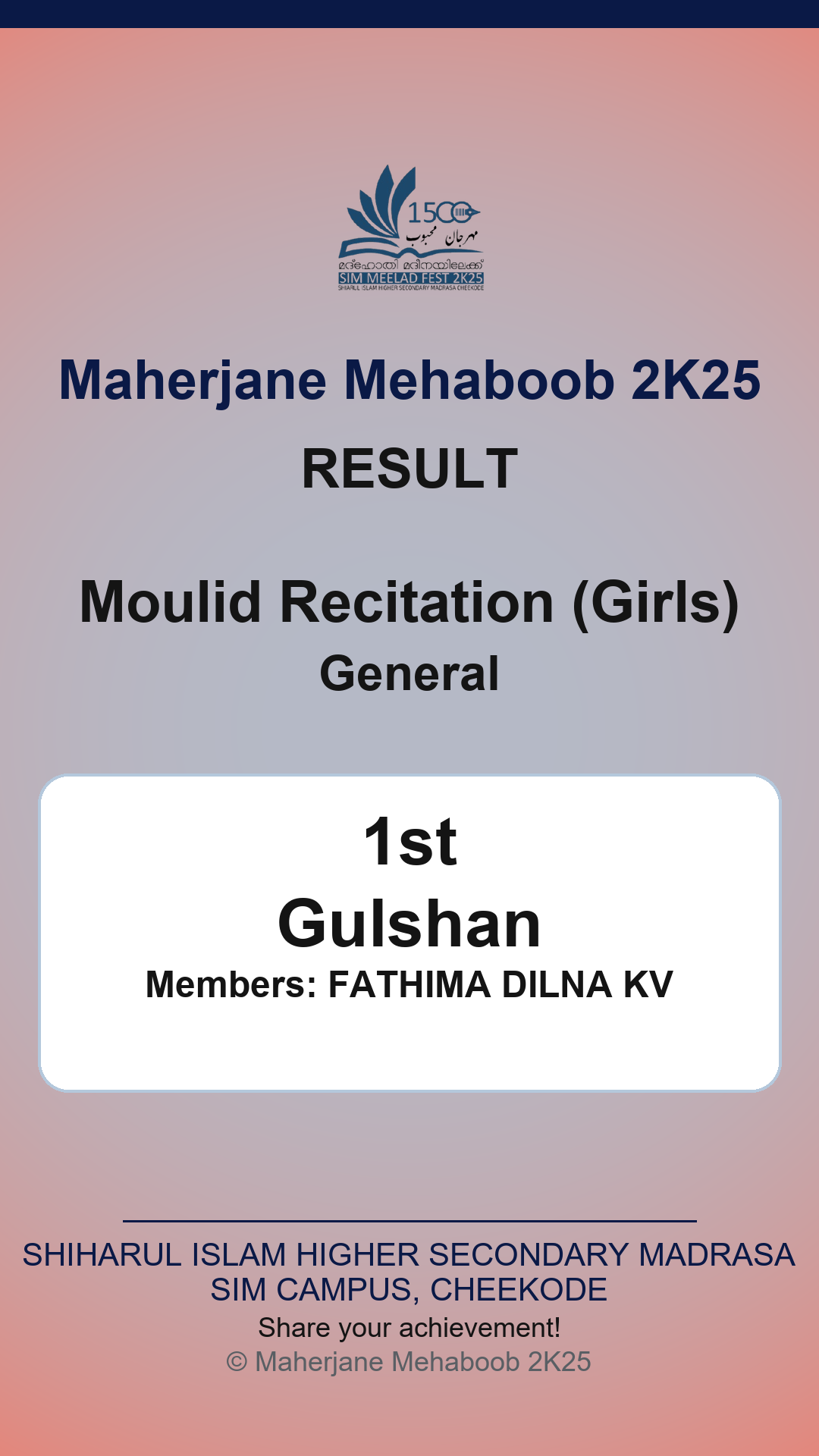 🥇 1st Muhiyudheen Mala (Girls) (General) Gulshan